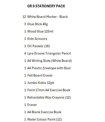 This stationery pack includes the items required by all Gr 0 students. There are additional items that you will need to bring on the first day of school: