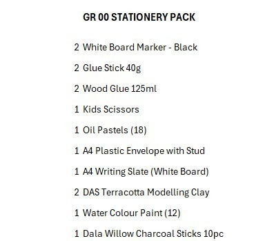 This stationery pack includes the items required by all Gr 00 students. There are additional items that you will need to bring on the first day of school: