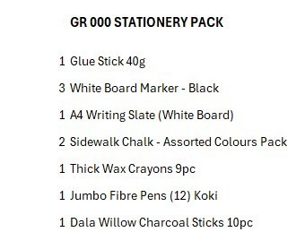 This stationery pack includes the items required by all Gr 000 students. There are additional items that you will need to bring on the first day of school: